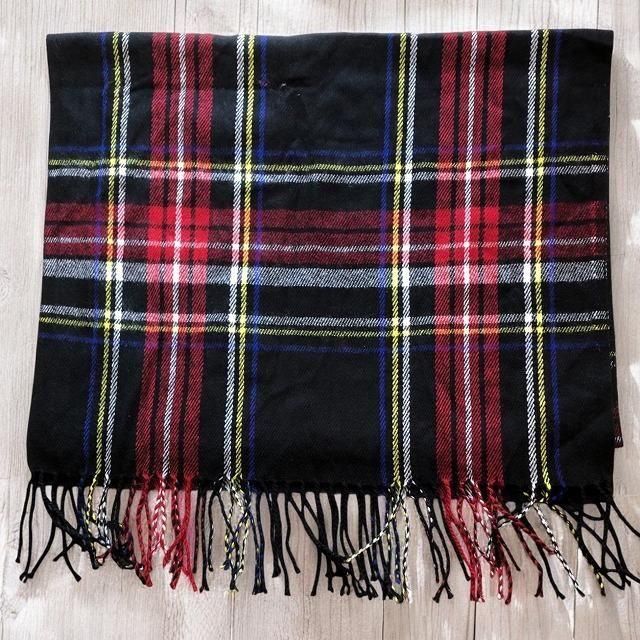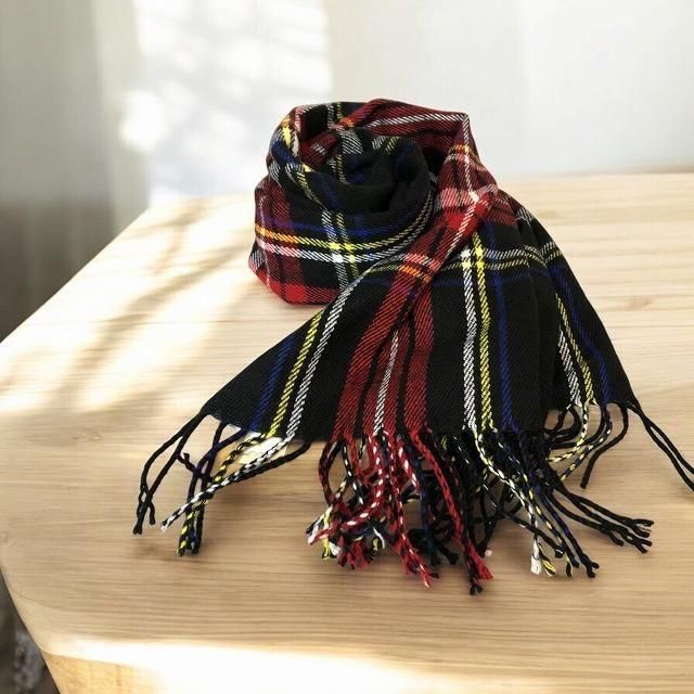 シックなブラックベースのタータンチェック柄のフリンジ付きストール!